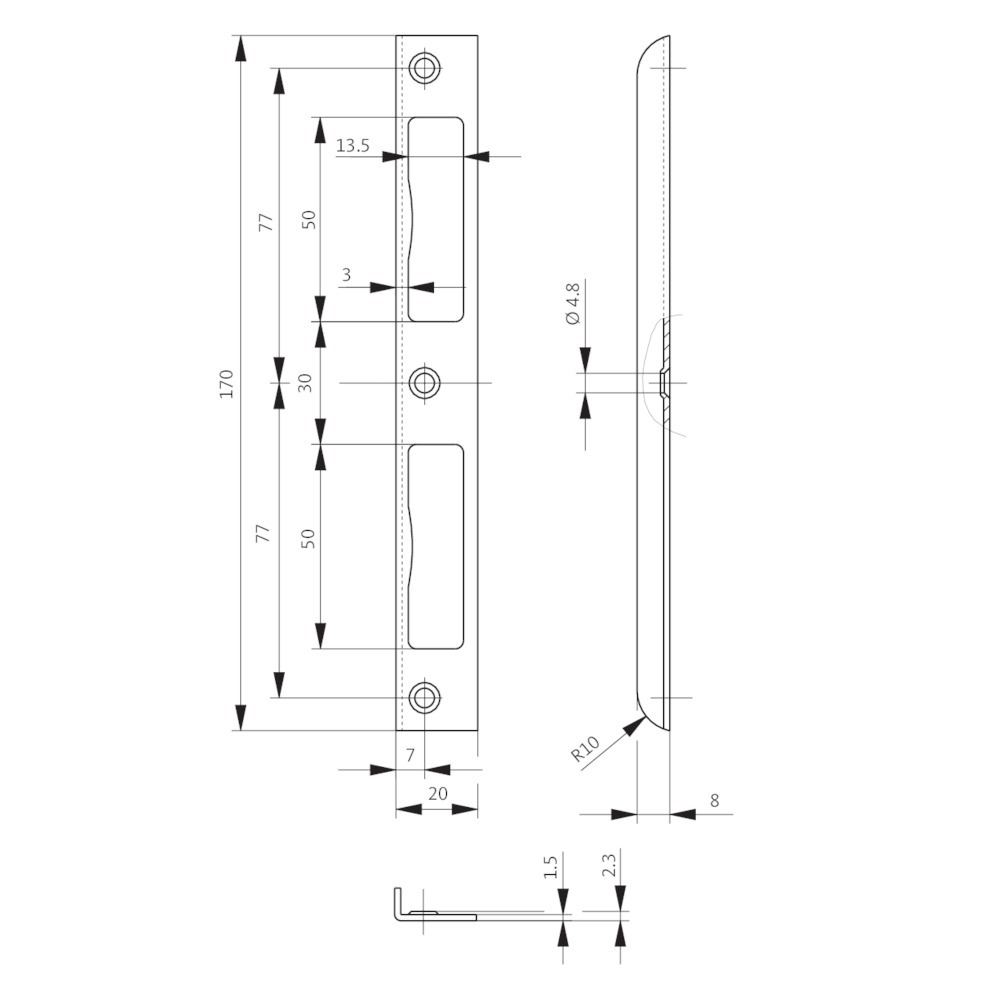 BKS Winkelschließblech S411; Produkttyp: Winkelschließblech; Produkttyp (Hersteller): Winkelschließblech; Ausfräsung: mit Fallen und Riegelausschnitt; Material: Stahl; Einsatzbereich: Türrahmen; Ausführung: mit Kunststoffeinlage; Form: kantig; DIN-Richtung: DIN Links-Rechts; geeignet: für Einsteckschlösser nach DIN; Farbe: silber; Farbton: nickelsilber; Oberfläche: lackiert; Schließblechbreite: 20 mm; Schließblechlänge: 170 mm; Schließblechtiefe: 8 mm; Materialstärke: 1,5 mm; Einlage: 1 tourig