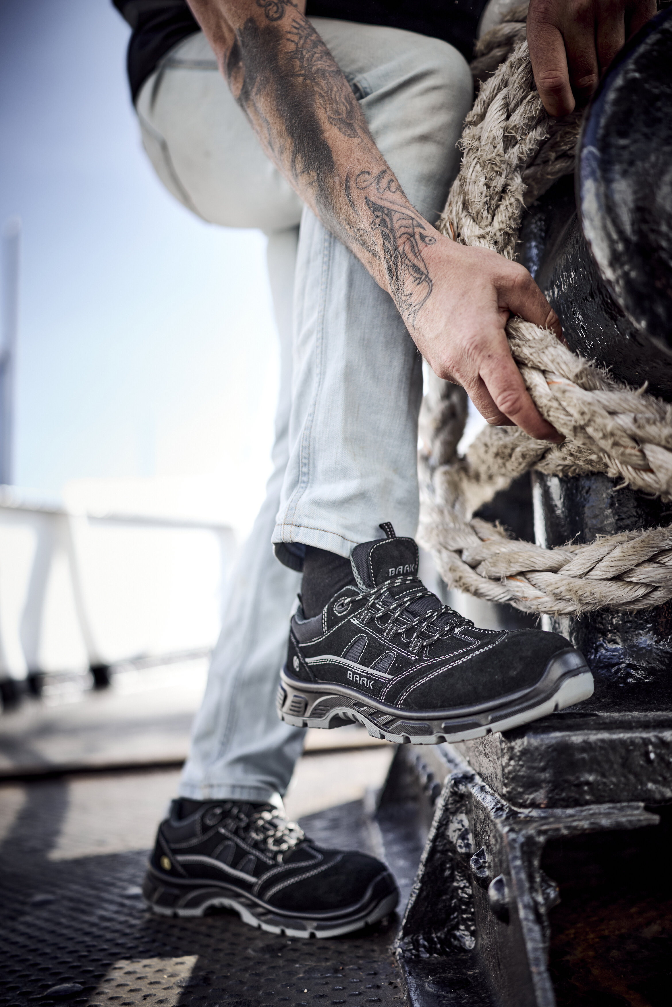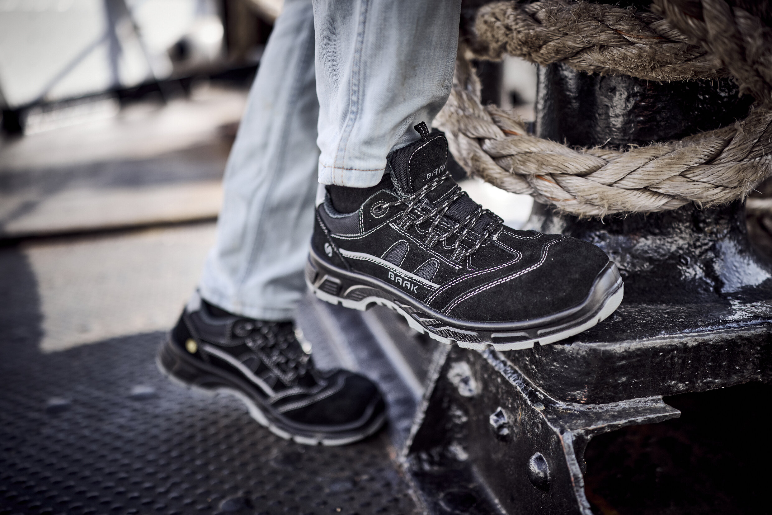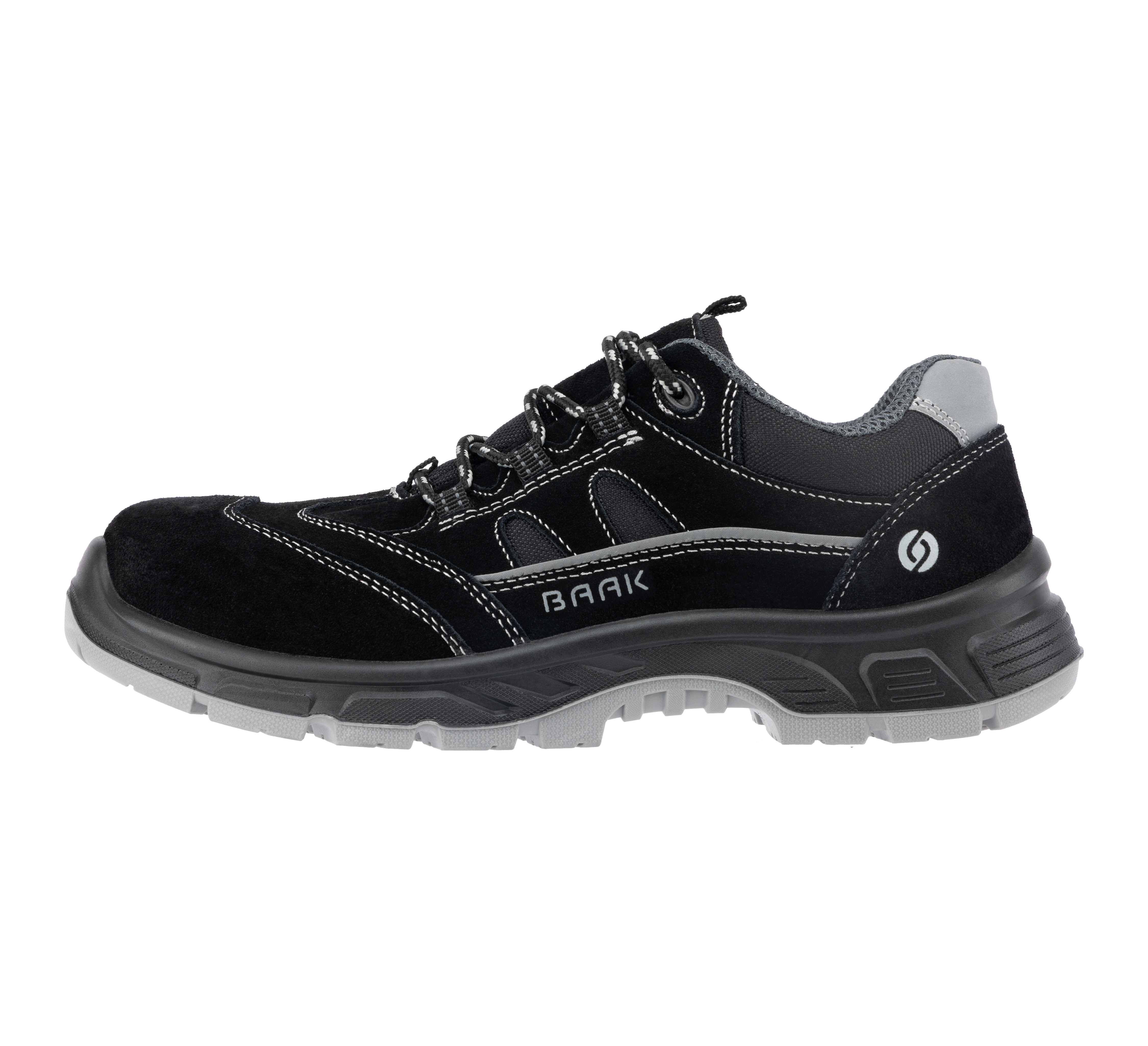 Mit Rindveloursleder-Obermaterial, Stahl-Flexkappe und textilem Durchtrittschutz (Baak NeoShield) bietet er zuverlässigen Schutz für Industrie, Werkstatt und Logistik.
