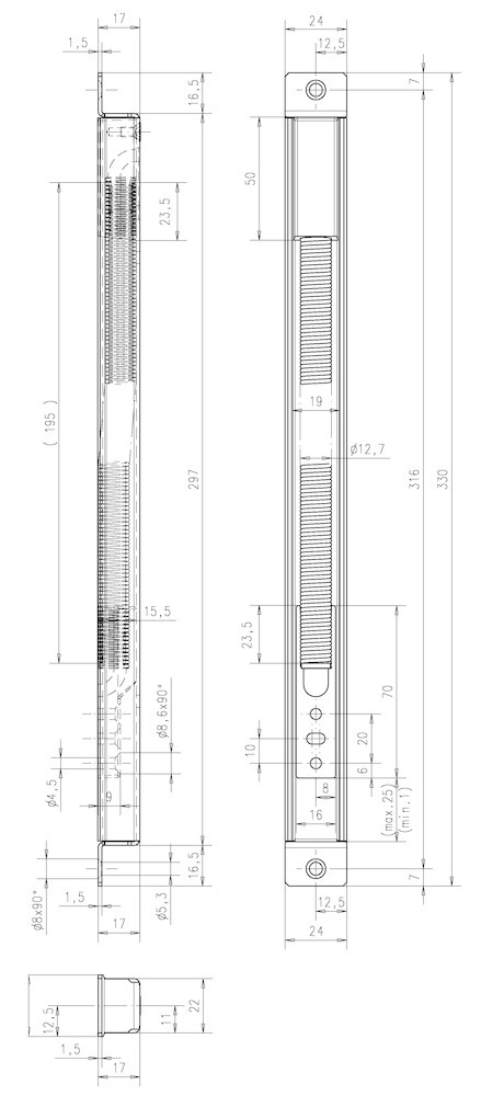 effeff Kabelübergang 10312; Produkttyp: Kabelübergang; Produkttyp (Hersteller): Kabelübergang; Ausführung: steckbar; Montageart: verdeckt; Gehäuse: einseitig; Leitungsdurchmesser: 7 mm; Material: Edelstahl; Material Einbaugehäuse: Edelstahl; Einsatzbereich: Tür; Länge: 330 mm; Breite: 24 mm; Tiefe: 17 mm; Farbton: edelstahl