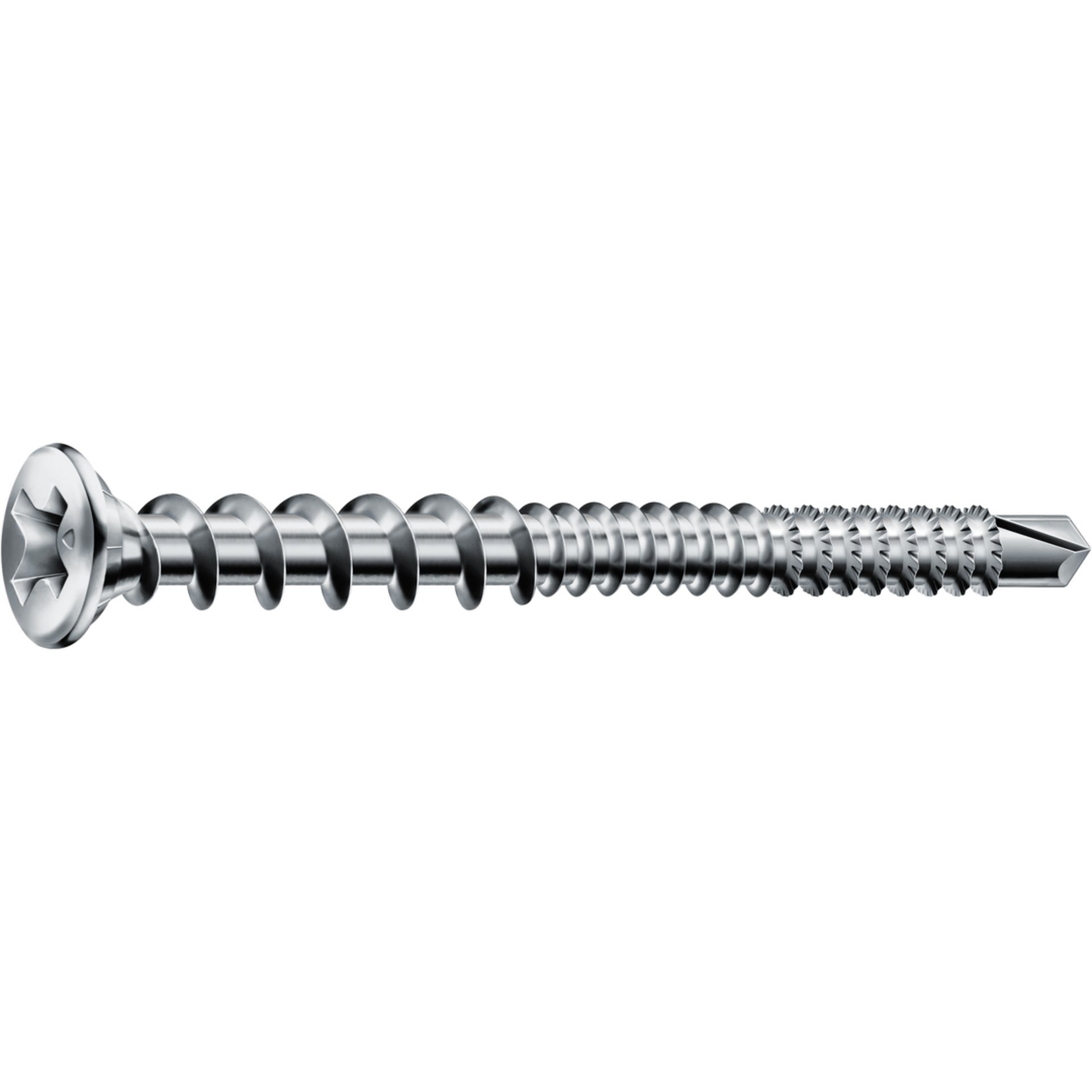 Die FEX Kombischraube haben wir für die Befestigung von Beschlägen und Ecklagern in Kunststofffenstern mit Stahlarmierung entwickelt. Sie besticht durch eine selbstschneidende Bohrspitze und zwei verschiedene, aufeinanderfolgende Gewindearten. Im oberen Bereich hat sie ein Grobgewinde für den Kunststoff, im unteren Bereich befindet sich ein Feingewinde für den Metallkern. Die Kombischraube ist mit einem Spezialsenkkopf mit angefasten Kopfflanken und Bremsrippen ausgestattet, was die Sicherheit gegen Überdrehen speziell bei dünnwandigen Kunststoffprofilen erhöht. Das bedeutet für Sie: Kein Vorbohren im Metallkern erforderlich, Sie können seriell arbeiten, ohne die Kunststoffprofile durch Überdrehen zu schädigen.