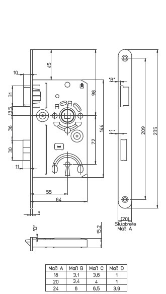 Format Einsteckschloss Kl.2 F+R Metall BB rechts 55/72/8 20mm abger. mit Flüsterkomf. Edelstahl matt 4317784618908