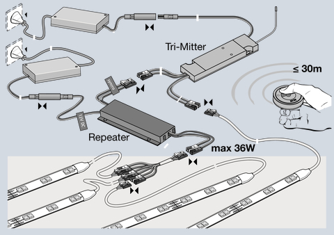 FORMAT Repeater Tri-Mitter MultiWhite; Schaltleistung max.: 36 W; Einsatzbereich: Multiwhite-Leuchten; Länge Repeater: 165 mm; Breite Repeater: 56 mm; Höhe Repeater: 16 mm; Basis: Repeater; Zuleitung: 150 mm