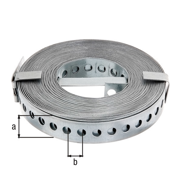 GAH Alberts Lochband; Basis: Lochband; Ausführung: Stahlband mit eingestanzten Löchern in verzinkter Ausführung; Werkstoff: Stahl; Oberfläche: sendzimirverzinkt; Gewicht: 1.023 g; Breite b: 12 mm; Breite: 20 mm; Stärke: 1 mm; Gesamtlänge: 10.000 mm; Materialstärke: 1 mm; Lochdurchmesser: 7 mm; Rollenlänge: 10 m