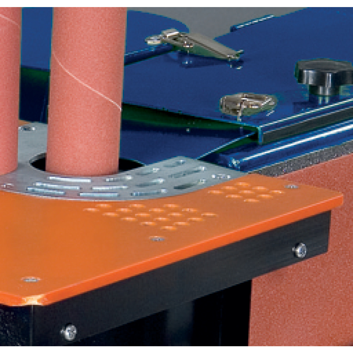 - Schleifhülsen-Einrichtung inkl. drei Gummiwalzen (Ø 38/50/76 mm), drei Schleifhülsen (Schleifbreite: 100mm), vier Tischeinlagen und höhenverstellbarem Tisch mit Absaugvorrichtung